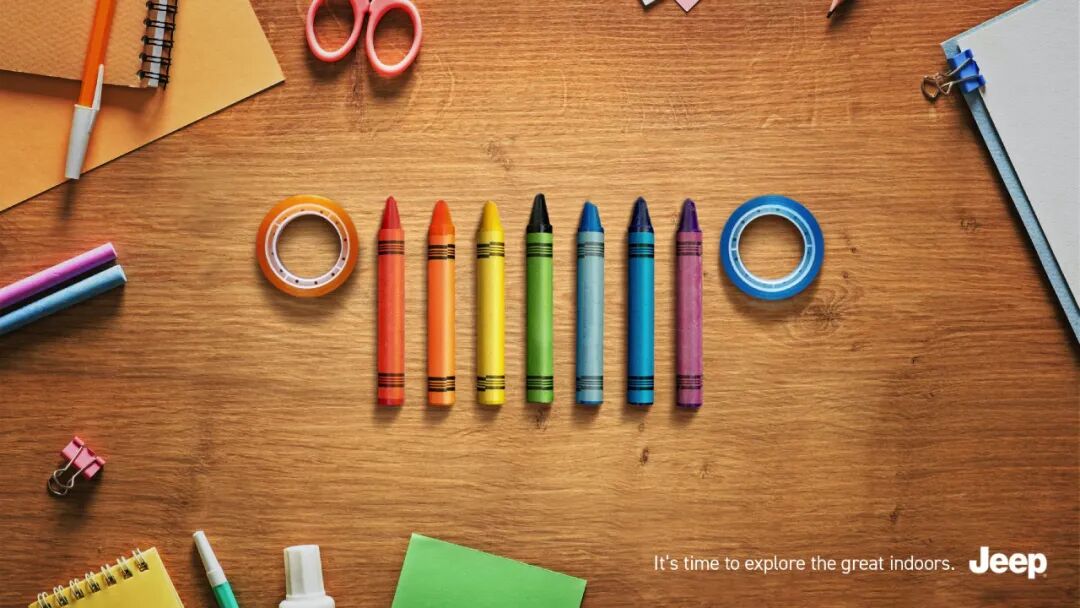 当疫情阻挡了Jeep向往自由用于探险的脚步,广告的画风也变得居家安逸起来,这组海报用家庭中常见的物品组成Jeep车标志性的外观,传达出“It's time to explore the great indoors”(是时候探险“家”了)的广告主题。不久之前秘鲁Jeep也发布了一张创意平面,巧妙地转换视角展现了疫情期间Jeep在车库中看到的风景,曾经跨过山河大海探索更精彩的世界,现在才发觉家才是最美的风景。
