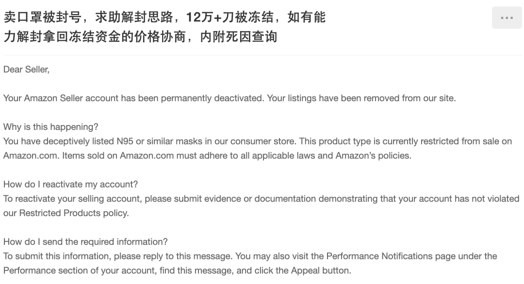 最近,一位卖家在论坛发帖求助,因其卖口罩被亚马逊封号,超12万刀被冻结,目前正在重金寻求能够拿回冻结资金的解封思路。