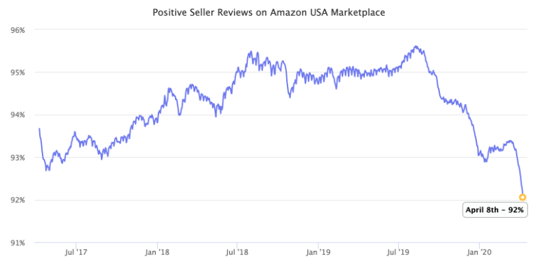 而美国站3月的好评率仅为92%,是其三年多来的最低水平,Marketplace Pulse 预计到4月底,这一比例还将降至90%以下。