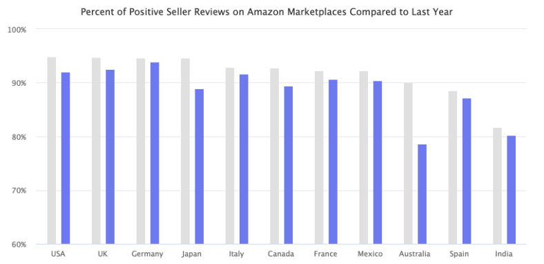 Marketplace Pulse 通过对800万卖家的数百万条评论进行分析,最终得出结论——亚马逊全球站点的好评率稳步下降。