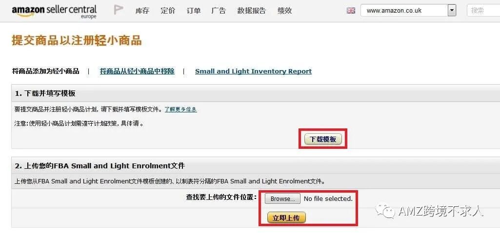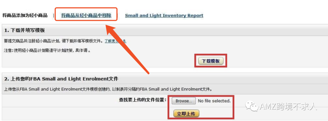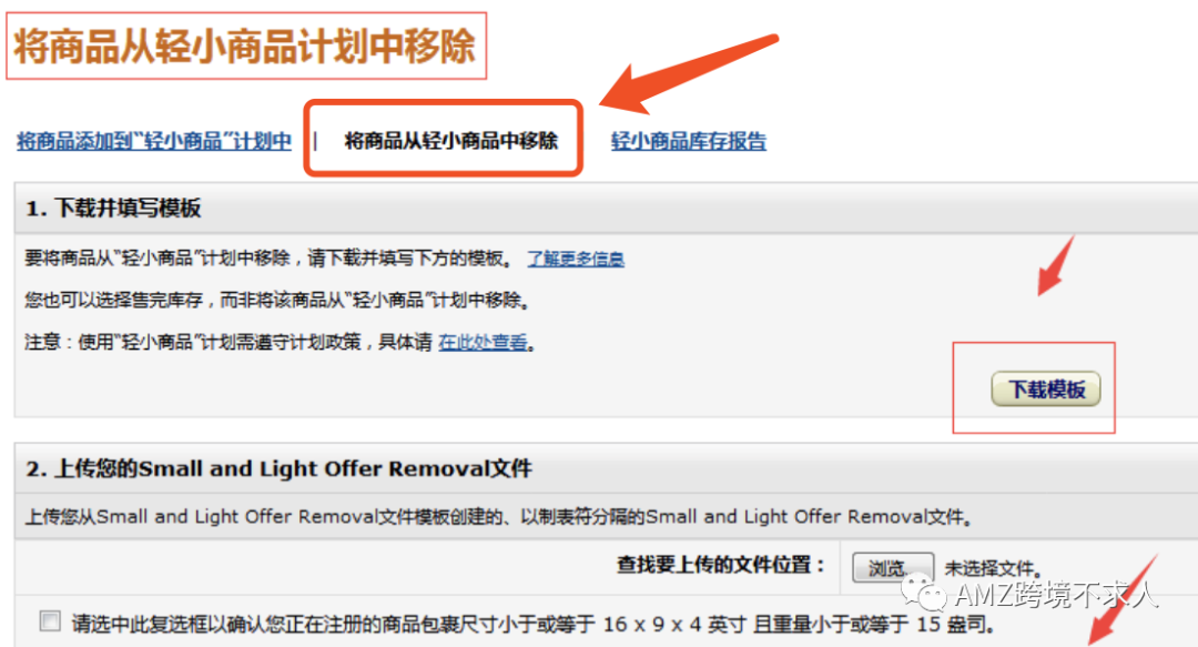 之后切换到“将商品从轻小商品计划移除”页面,下载模板,然后填写后上传即可。如下图: