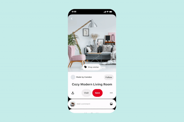 为了延续这一主题,Pinterest现在还在视觉搜索结果中添加了一个新的“相似商店”按钮,这将使人们在基于Pin内容寻找灵感时,更容易将搜索结果添加到即时可用的产品上。正如你在这里看到的,现在,当你在Pinterest中使用对象识别时,你也可以选择将你的匹配范围缩小到可购买的产品,从而简化期间的购买路径。正如您在这里看到的,现在,当您在Pin中使用Pinterest的对象识别时,您可以选择将您的匹配范围缩小到可购买的产品,从而简化您的购买路径。