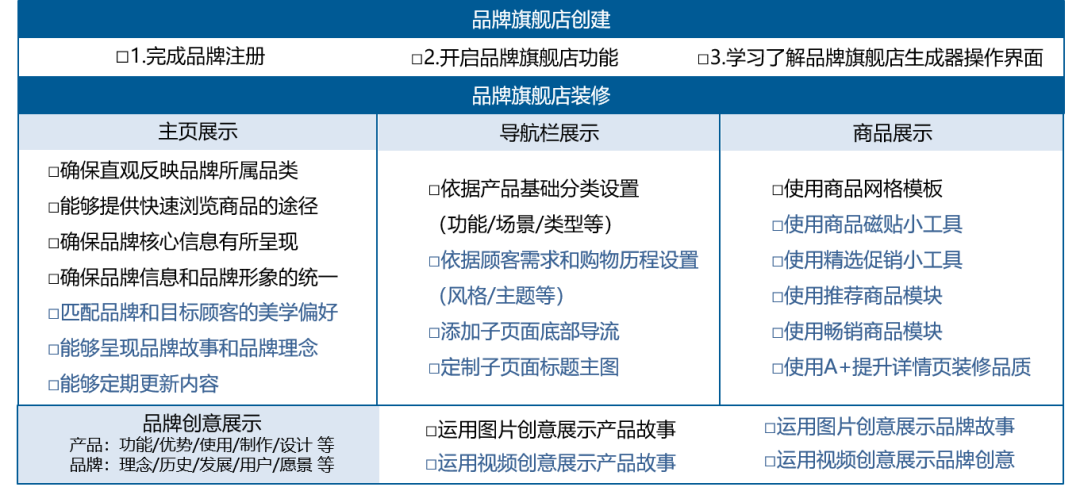 首先,目标明确了之后,才能更好地进行规划和进步。 定准店铺装修目标后,咱们进入重点,给大家介绍这份超实用的「品牌旗舰店装修指南」。 主页展示篇 基础装修 ● 直观反映品牌所属品类,让顾客一眼知道你卖的是什么产品。 ● 传递品牌核心信息,抓住每一次曝光的机会。 ● 确保品牌旗舰店的讯息、语调和视觉形象与品牌在其他媒体上的外观保持一致。 进阶装修:优秀案例 ● 匹配品牌调性和目标顾客美学偏好(如Oral-B, 用牙医形象体现品牌的专业性)。 ● 呈现品牌故事和品牌理念。 ● 定期更新内容,保持品牌吸引力(Oral-B,现在用的是美国牙医专业机构认证的ADA标来体现专业性)。 导航栏展示篇 基础装修 系统自动分类生成 ● 按功能 ● 按类型 ● 按使用场景 进阶装修:优秀案例 ● 设置逻辑基于对顾客需求状态(如商品组合陈列、商品使用对象)、购物历程的了解和顺应。 ● 创建时从宽泛的品类开始,向下深挖更加细分的商品,帮你的顾客快速浏览内容,并进行针对性探索。 ● 考虑在子页面的底部显示指向品牌旗舰店其他位置的链接,这样便会有更多购物者查看旗舰店各部分的内容及你的各种商品。 ● 导航栏引导的子页面的标题主图同样需要重视。 商品展示篇 基础装修 ● 可以直接使用商品网格。 ● 建议考虑主ASIN、独特或有趣的ASIN、新商品等,让顾客品牌体验更加良好,店铺好感度up!up!up! 进阶装修:优秀案例 ● 使用商品磁贴突出显示某个ASIN ● 使用精选促销小工具展示商品,它将自动加入所有“促销”的ASIN,不需要你再手动操作;若有定期的促销计划,建议为促销单独建立页面添加进导航栏,方便品牌顾客查看。 ● 使用畅销/推荐商品小工具展示商品 创意品牌表达篇 产品表达 ● 融入联想,让产品更有温度 品牌故事表达 ● 展现品牌历史与愿景,打造品牌影响力 产品&故事表达 ● 展现产品背后的环节,打造匠心 为了方便各位卖家日常“修炼”,我们把上述内容精华都总结为这份「进度自查表」,点击保存,随时随地查看旗舰店优化进度。 PS:黑色为基础装修标准,蓝色为进阶装修标准 ● 屏幕自适应坑:注意移动端和电脑端呈现效果的不同哦! ● 内容加载坑:大幅图片加载慢,全幅图应仅包含在主页、商品类别页面顶部或底部这类战略性位置上。 ● 基础错误坑:谨记细小错误不要犯(如:大小写用法、标点符号),粗心马虎可能会拉低店铺印象分喔! 看完店铺装修指南后,尝试把自己的品牌店铺装饰一新,提高自己的品牌知名度吧!