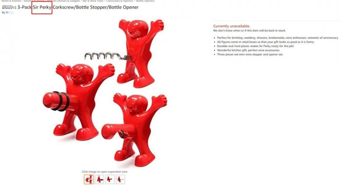 侵权关键词(已有注册商标,且有正在维权的案件): “MR BANANA”“SIR PERKY” “MRS PERKY” 锁定产品-瓶塞,开瓶器和倒酒器以及纸巾挂钩