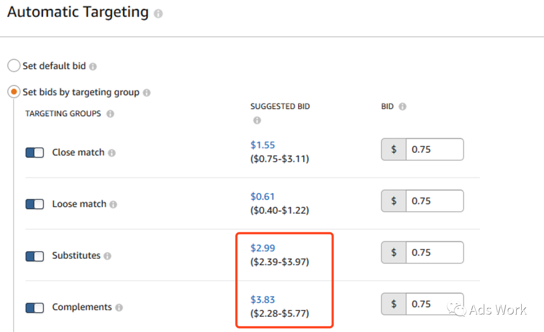广泛匹配广告使用建议出价:Min.推荐出价 < 广泛匹配 bid < 推荐出价;