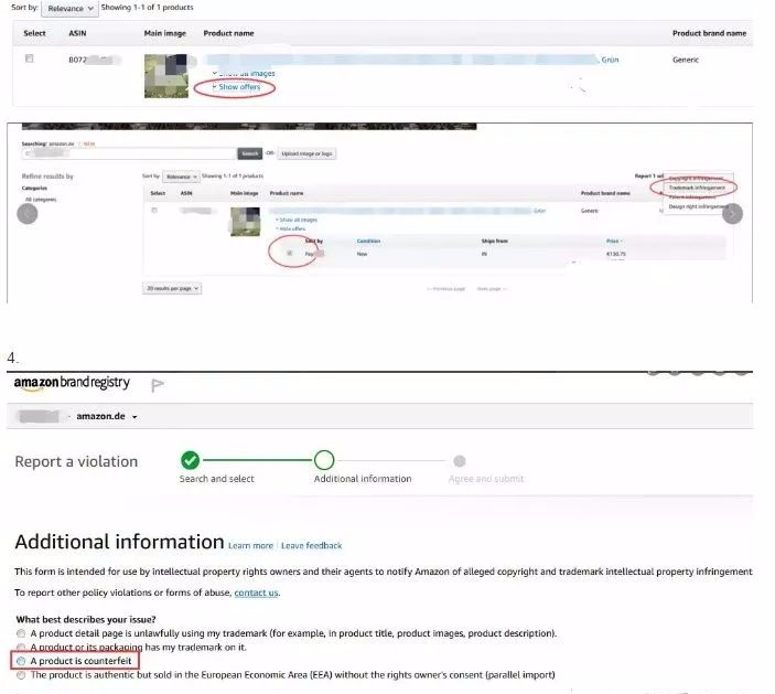 3.输入找到被跟卖的产品链接,点击show offers,勾选要投诉的卖家,然后选择Trademark Infringement。注意,一定要勾选跟卖卖家,不要勾选ASIN前面的那个框哦,否则整个ASIN都可能被移除。