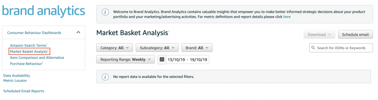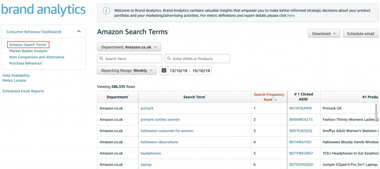 1.亚马孙搜索词报告(Amazon Search Term Report)你只要在这个报告中输入关键词或者ASIN就可以进行查询,还可以按照站点进行过滤,报告范围可以选择每日、每周、每月和每季度。Search Term:消费者所使用的搜索词,可以是短尾关键词,也可以是长尾关键词。Search Frequency Rank:特定时期内关键词的搜索频率排名。虽然亚马逊没有给出具体的搜索量,但是对于了解关键词的热度还是很有帮助的。#1 Clicked ASIN:所选时间内,根据搜索结果点击量最高的ASIN。#1 Click Share:所选时间内,该产品获得的点击量占搜索词结果总点击量的百分比。比如有1000位客户搜索了“笔记本电脑包(laptop bag)”,每位客户点击了3种产品,总点击次数是3000次,搜索结果中的产品A获得了其中500次点击,那么产品A占该搜索词总点击次数的16.67%。#1 Conversion Share:该产品获得的转化次数占搜索词总转化次数的百分比。比如搜索词“笔记本电脑包(laptop bag)”有1000笔销售,产品A获得了100词销售,那么产品A的转化占比就是10%。由于点击量最多不一定会带来最高的转化,所以搜索次数占比最高的产品与转化次数占比最高的产品,可能不是同一种产品。2.购物分析报告(Market Basket Analysis)该报告主要提供消费者经常一起购买产品的相关数据,让卖家可以更好地制定捆绑和追加销售策略。3.产品对比和替代购买行为报告(Item Comparison and Alternative Purchase Behavior)该报告提供消费者同时浏览的其他产品,以及在浏览完你的产品后最终购买的产品详细数据。通过这些数据,你可以查看和分析竞争对手的产品,了解为什么消费者选择他们的产品而不是你的。如果替代购买的是你的其他产品,那么你也可以了解哪些产品更受消费者欢迎。Brand Analytics报告还提供两个按钮,包括: