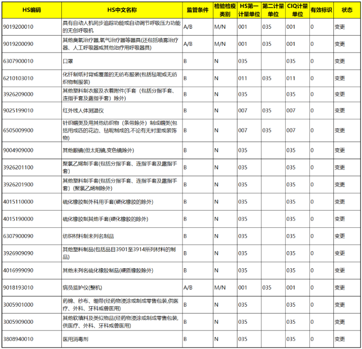 消息称:从今天(2020年4月10日)起,19个“医疗物资”类商品编码项目将实施进出口商品品质检验。