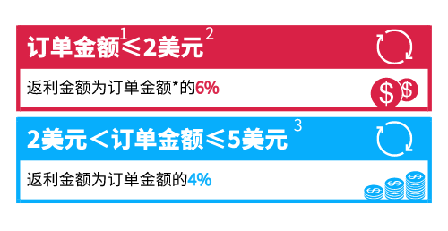第一阶段 (UTC时间2020年4月2日0时-4月7日1时) 6国符合条件的订单将享受策略性目的国返利政策支持。 >>>点击此处回顾政策说明 第二阶段 (UTC时间2020年4月7日1时-4月16日0时) 6国符合条件的订单将享受策略性目的国返利政策和策略性订单返利政策的叠加支持。最高可享受(4.25%+6%)=10.25%的返利支持。 需要注意的是,策略性目的国返利政策的每笔订单最高返利不超过3美元(对于本地代码为CNY的商户为21元人民币)的政策要求只适用于策略性目的国政策。 第三阶段 (UTC时间2020年4月16日0时-4月22日1时) 包括上述6国在内的几乎所有国家的符合条件的订单将享受策略性订单返利政策支持。