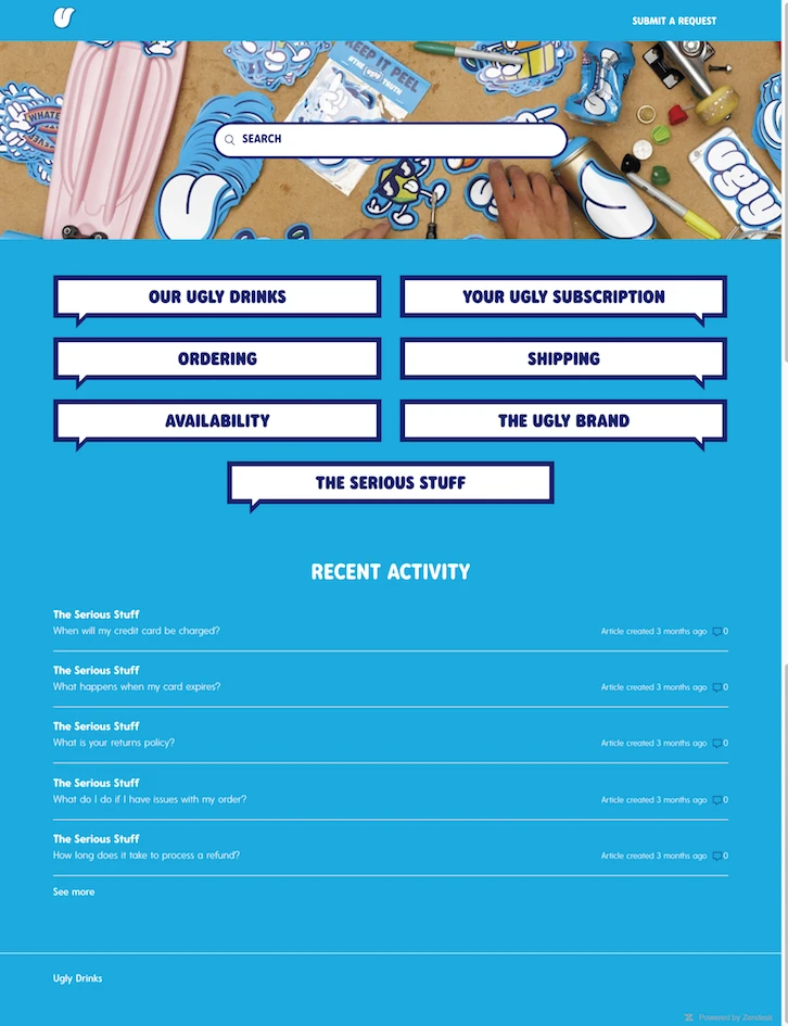 常见问题解答(FAQs):在商店启动之初,你可能没有掌握太多关于客户最常询问的问题的信息。这时,除了预测可能会被问到的问题,你还可以查看竞争对手的页面,了解他们在网站内最长回答的问题,以此为基础来制作自己的有效的FAQ页面。客户的问题通常围绕运输,退货政策以及取得联系方式这三个方面展开。Ugly Drinks 在 Zendesk 上建立了可搜索的常见问题页面。