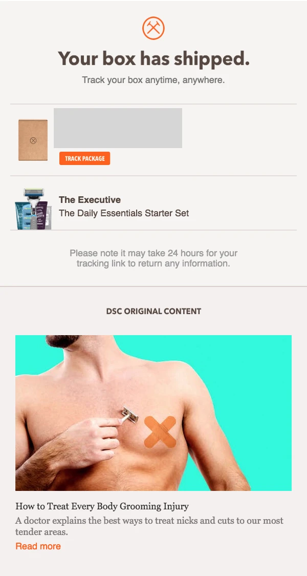 Dollar Shave Club 使用带有商标的模板作为其发货通知的电子邮件。