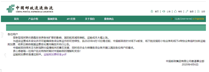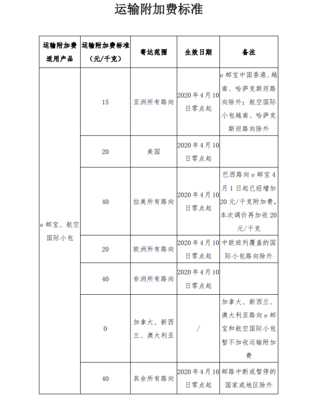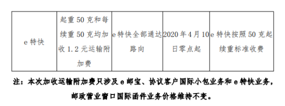 自2020年4月10日零点起,将对线下e邮宝、线下航空国际小包业务和线下e特快业务临时加收运输附加费,结束日期将根据运费变化情况确定并另行公告。