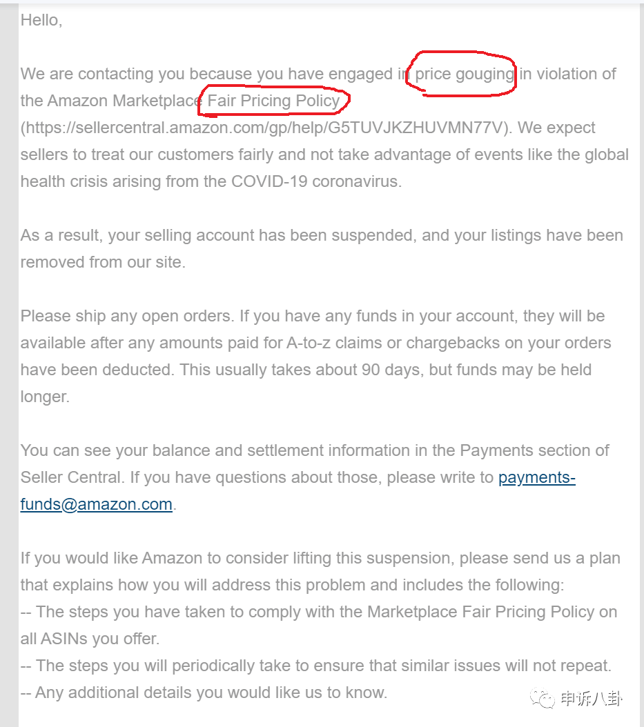 如果产品定价并不高,而且产品质量优异采购成本本来就高,而且有真实的采购单或者发票,那我的申诉策略就是指出亚马逊关店不合理,一条一条列出理由,一般是这么几条:(1)中国国内大部分生成厂家被政府征用,市场上供不应求,价格本来就比平常高出50%以上;Because of most manufacturers in China arerequisitioned by the government, which leads the market is in short supply, andthe price is more than 50% higher than usual.(2)由于航空物流管制,导致物流成本急速攀升,当前的物流成本比平常高出40%;Due to the aviation logistics control, the logisticscosts have risen rapidly, and it is 40% higher than usual;(3)由于疫情影响,口罩生产原料价格激增,而且中国国内工人未完全复工,人员成本上涨,最终导致口罩生产成本比平时高出60%以上;Due to the impact of the epidemic, the price of raw materials for face maskproduction has increased sharply, besides, the workers in China have not fullyresumed, resulting in the production cost of face masks being more than 60%higher than usual;(4)为了美国消费者的利益,我们采购的KN95口罩是具有非常高的标准,有CE, FDA安全认证,质量在同类产品中处于顶端,采购价格也比普通口罩高出30%以上;For the benefit of American consumers, we only purchase the very highstandards KN95 face masks, which are approved by the CE and FDA safetycertifications. Compared other face masks in the market, we can sure that our qualityis at the top , so, the purchase price is more than 30% higher than ordinarymasks. 当然,第4点目前可能已经不再适应,因为FDA拒绝KN95标准,但是貌似前几天又变脸了。总之,根据实际情况来申诉。 申诉信完成后,我又附上了采购单和发票,证明确实成本高昂。结果证明这招好使,1一天后就收到了亚马逊发来的解封邮件。 如果产品定价确实虚高。那么最好是在亚马逊还给你改过自新的机会的时候乖乖承认错误,保证不再违反。 那么,什么情况是违反公平定价原则的呢?亚马逊是这样规定的:• 为商品设置过高的价格,使其明显高于亚马逊提供的当前价格;或• 销售同一商品时,多件销售的价格比单件销售时高。 因此,价格明显高于一般卖家很多倍;打包一个PACK销售的价格比单卖还贵;产品不赚钱从运费上赚钱等等,都是违反这一条例的。(1)我不了解亚马逊对于公平定价的相关规定,导致给产品设置了明显不合理的价格;I don’t understand Amazon ’s policy on FairPricing, which resulted in obviously unreasonable prices for products(2)或者,运营人员因为操作失误,不小心错误设置了过高的价格;Due to the occasional operation error, my employeeset excessively high price mistakenly.(1)我立即删除了所有错误的报价,并且设置了一个合理的价格;I immediately deleted all ASINs with wrongprice, and set a reasonable price.(2)通过重新学习亚马逊对于公平定价的准则,我现在非常了解该如何给产品设置合理的价格;By learning Amazon ’s policy for fairpricing again, now I totally understand how to set reasonable prices forproducts.(1)以后发布产品前,我将严格检查产品说明,包括产品价格,图片,标题等等;Before releasing the product in the future,I will strictly check the product description, including product price,pictures, title, etc.(2)定期阅读亚马逊规则,保证时刻知晓亚马逊对于卖家的相关规定,保证不犯类似的错误;I will read Amazon ’s policy regularly toensure that I am always aware of Amazon Seller Code , and I promise that I willnot make similar mistakes again in the future. 事实证明,该申诉策略有效。因为我同样收到了亚马逊的解封邮件。
