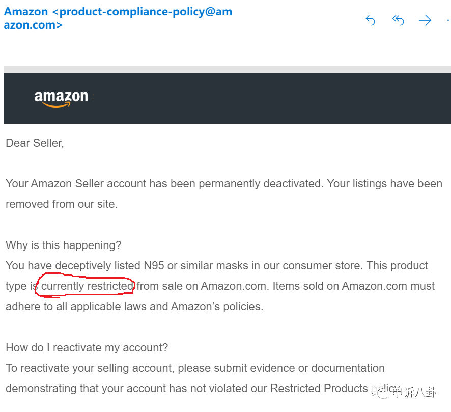 只要邮件中包含“price gouging”或者“Fair Pricing Policy”,那么可以肯定账号违反了公平定价原则。 顾名思义,就是口罩在亚马逊该站点属于有条件限制出售,或者严格禁止出售的产品。由于都告诉你了不能卖你硬要卖,那么不好意思,我就要封你的店。