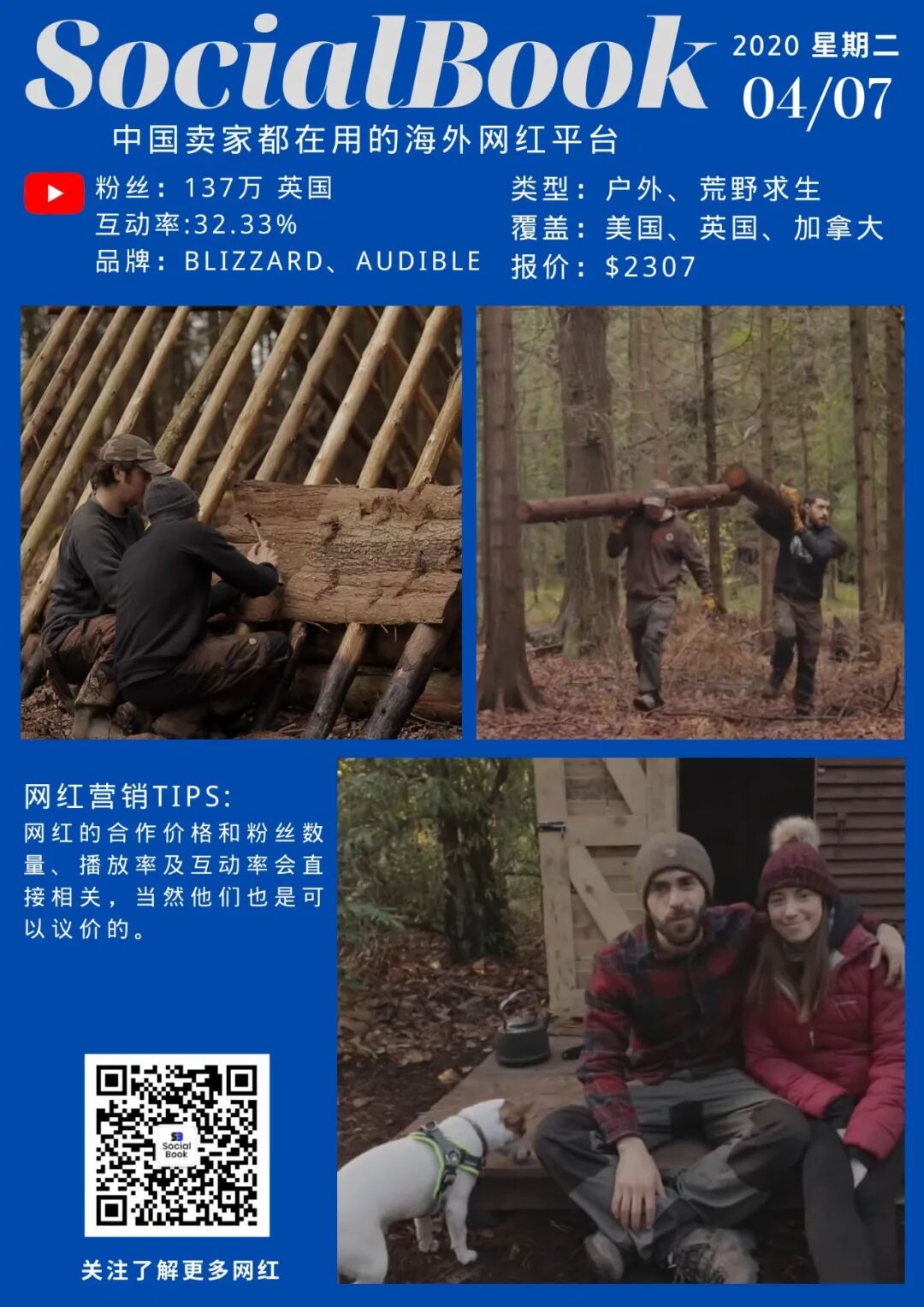 这是一位不折不扣的长视频博主。视频内容主要都是野外生活相关的,劈柴、烤肉不在话下,粉丝的忠诚度很高。几乎每一集他都搭建了一个新的木屋,非常有意思。在SocialBook你能找到全世界各地那些有趣的人,甚至还能与他们发生合作,大胆尝试吧!