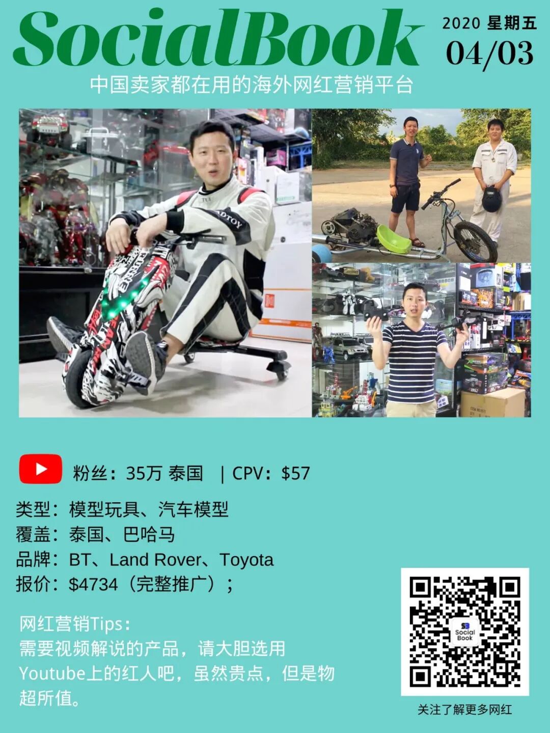 拥有自己玩具店的泰国博主,看起来非常日常,就像身边的路人甲。可这样一位普通人竟然拥有35万粉丝,视频中有很多都是自己试玩的内容,带货能力也是有目共睹,粉丝们都很买单哦。SocialBook的魅力就在于你想卖的货,都能帮你找到对的人!