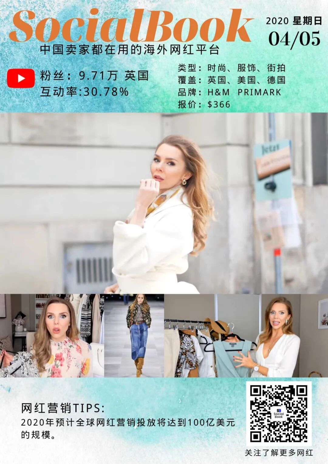 一头金褐色卷发的时尚街拍博主,永远在追随本季的流行服饰,所介绍的穿搭都非常耐看、时髦,身材火辣,除了细心讲解自己的装扮心得,更能在视频中看到她诸多的迷人街拍,粉丝互动率很高,合作价格也非常合理,如果是服饰类的卖家,不要错过她!