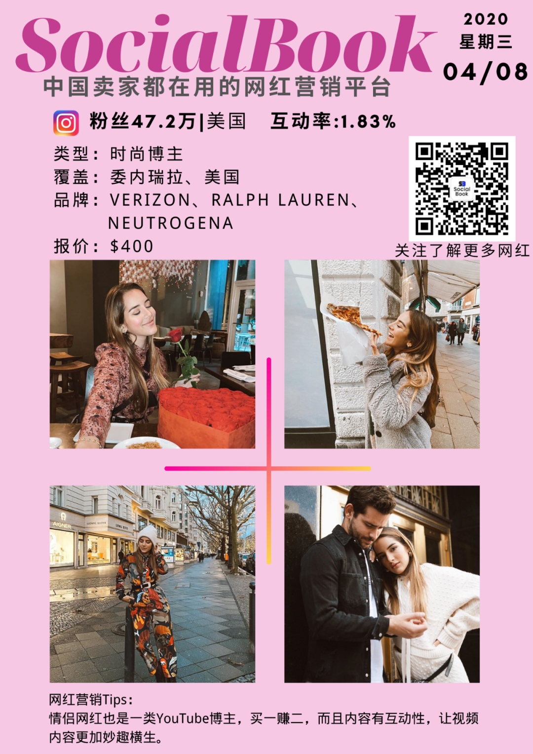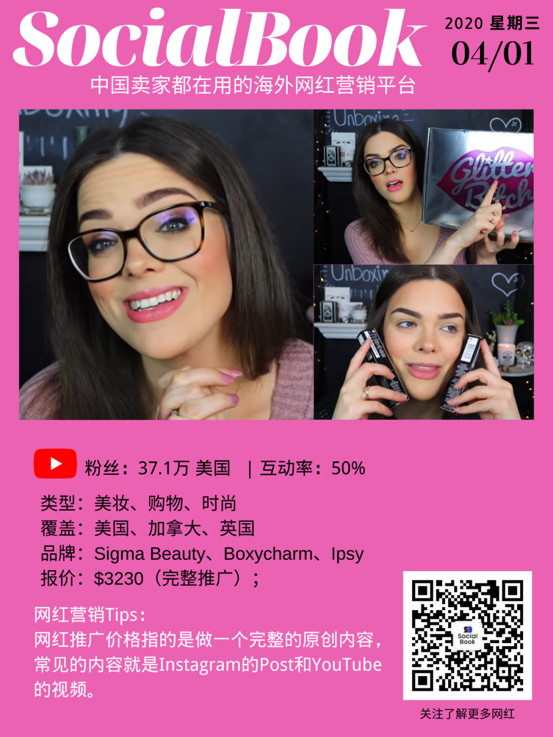 让我们关注一下与她合作的价格,哇,真心不贵。如此高性价比的网红,千万不要错过哦~~~快来SocialBook寻找你们心目中的最佳网红吧!