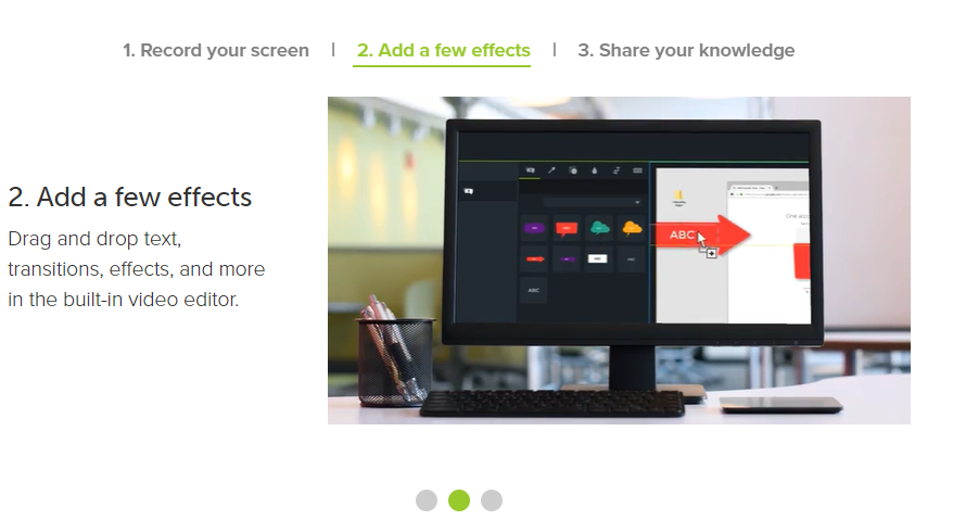 在电脑桌面或者IOS设备上录制视频和音频 侧边栏有多种特效,通过鼠标拖拽就能应用到视频当中,还能设置出现的时间 插入放大和缩小功能,添加动画,设置转场效果 录制PPT页面,还可以添加录音和标题等