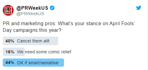 前几天,美国公关营销资讯平台PRWEEKUS在愚人节前进行了一番投票 ▼