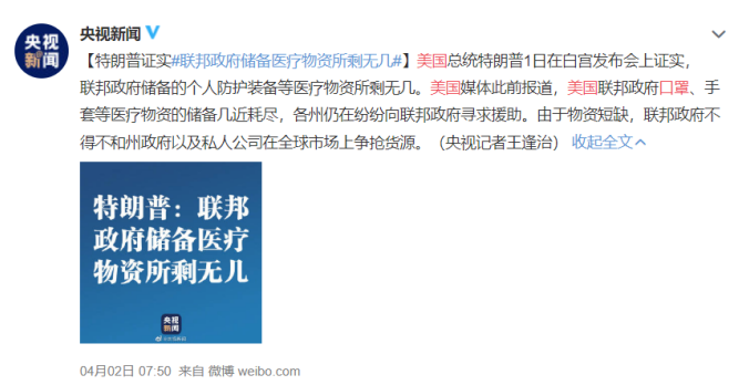 美国总统特普朗在白宫发布会上证实,联邦政府储备医疗物资已所剩无几。据央视新闻消息,美国媒体此前报道,美国联邦政府口罩、手套等医疗物资的储备几近耗尽,各州仍在纷纷向联邦政府寻求援助,由于物资短缺,联邦政府不得不和州政府以及私人公司在全球市场上争抢资源。