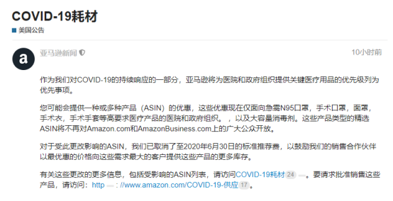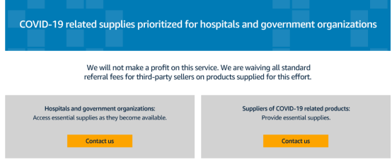 1. 亚马逊将为医院和政府组织提供关键医疗用品列为优先事项。现向卖家征集N95口罩、手术口罩、面罩、手术衣、手术手套、大容量消毒剂!