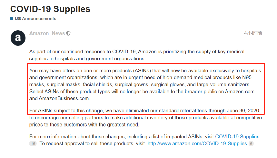 您可能是一种或多种产品(ASIN)的供应商,这些产品现在仅面向急需N95口罩,手术口罩,面罩,防护服,医用手套以及大容量消毒剂等高要求医疗产品的医院和政府组织。这些产品类型的选定ASIN将不再对mazon.com和AmazonBusiness.com上的广大公众售卖。