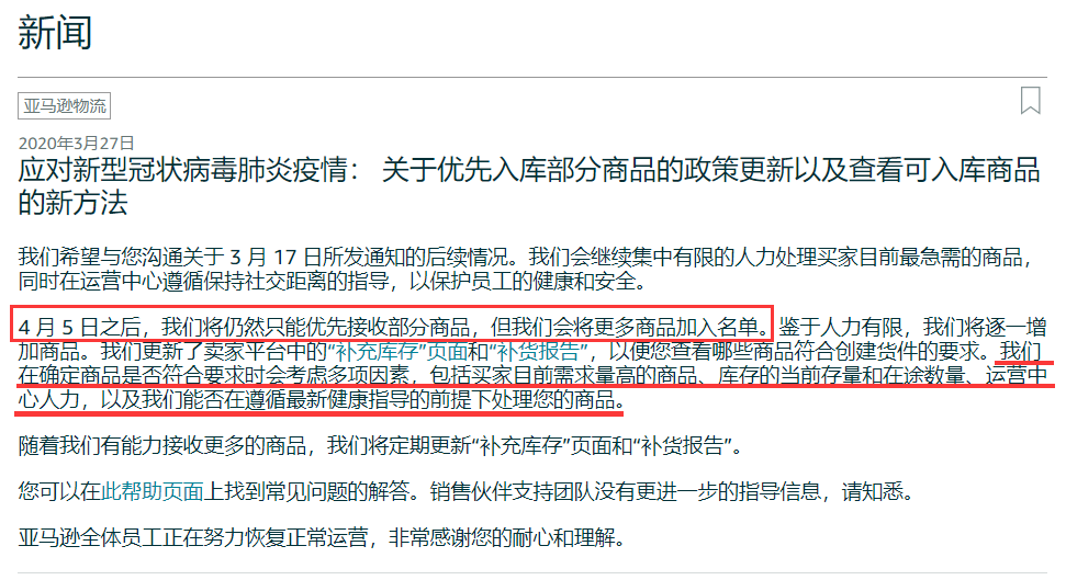 原本4月5日就快来临,亚马逊FBA补货的希望就在眼前了。可是近日,美国站和欧洲站又相继发布公告,宣布“必需商品优先,暂停非必需品入仓”政策将会在4月5日之后继续执行,并且截止日期未定。给了卖家们一个晴天霹雳。