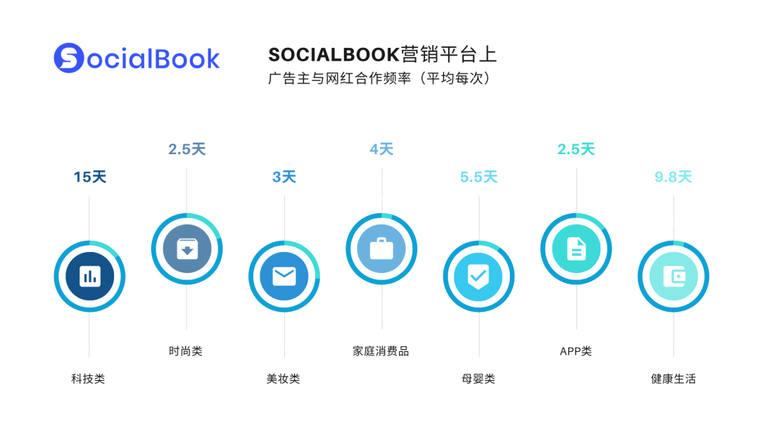 时间推移到2020年,越来越多的全球用户开始频繁与网红达成各种合作,不仅仅是最开始只有大网红合作,随着广告成本增高,各行各业开始逐渐改变营销方式,甚至利用平台工具搭建自有网红库,形成每月每周都与小网红展开各种形式的贴图合作,不断在世界面前进行刷脸从而引导销量的快速增长。企业针对网红合作的痛点已经从找到1-2个网红转变为如何快速管理成百上千的网红并持续与他们低价格高质量的合作。在中国,广告主可以通过相关网红营销工具来进行网红合作推广,根据SocialBook后台数据,科技类、母婴类、家庭消费品、时尚美妆类、APP类的广告主与网红合作的频率已经提升到平均每7-8天合作一次。