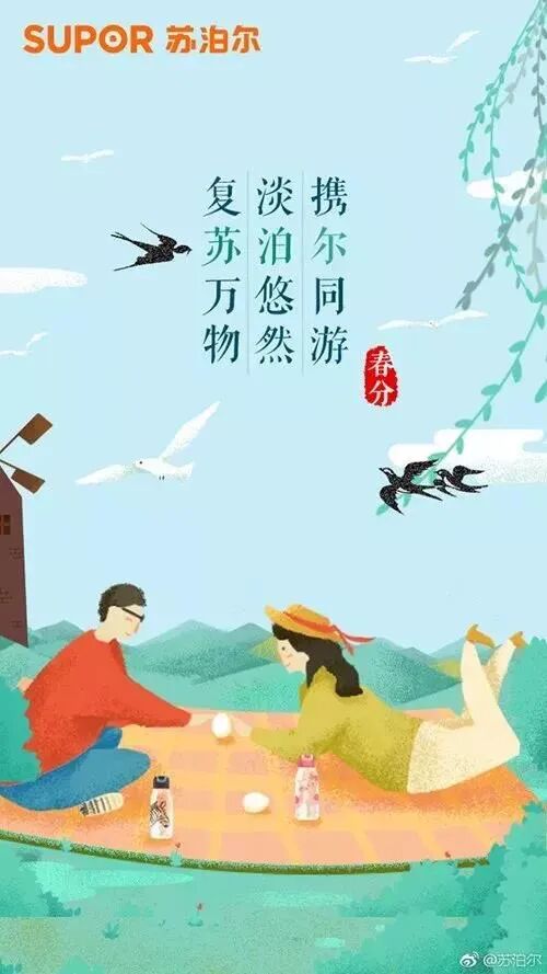 比如下面苏泊尔的海报,确实通过拆字的方式强调了品牌特性(品名),但是整体画面和文案只显示了春游,主题元素“春分”则是小小个地放在一侧,如果把“春分”二字替换成“立春”、“清明”也是没有违和感的。