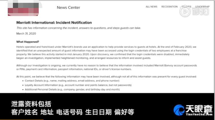 3月31日,万豪国际集团发布公告,称约520万名客人的信息可能被泄露,包括姓名、地址、联系方式、偏好等。2018年,万豪曾发布公告称,约5亿名住客的信息被泄露。