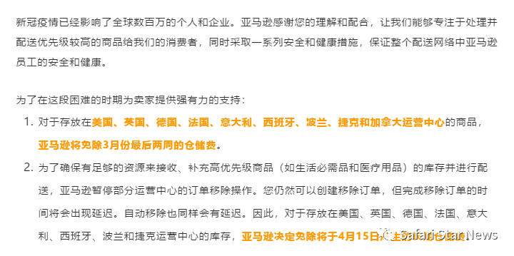 对于存放在美国、英国、德国、法国、意大利、西班牙、波兰和捷克运营中心的库存,亚马逊决定免除将于4月15日产生的长期仓储费。