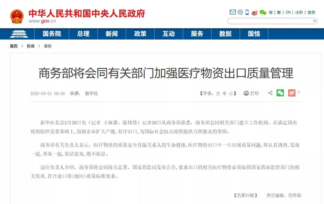 3月31日,商务部、海关总署、国家药品监督管理局公告2020年第5号 关于有序开展医疗物资出口的公告: