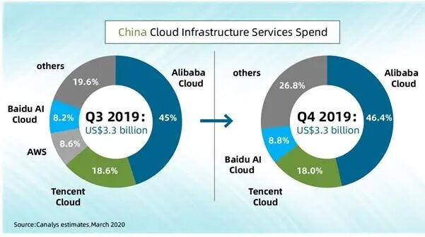 根据英国调研机构Canalys发布了2019年第四季度中国公共云服务市场报告:2019年第四季度,中国云计算市场规模达33亿美元,持续保持高速增长。数据显示,在2019年第三季度,阿里云排名第一,份额为45%;腾讯云份额18.6%、AWS份额8.6%、百度智能云份额8.2%。到2019年第四季度,阿里云份额扩大至46.4%,腾讯云18%、百度智能云8.8%。从这个占比来看,市场份额绝大部分还是被巨头瓜分。