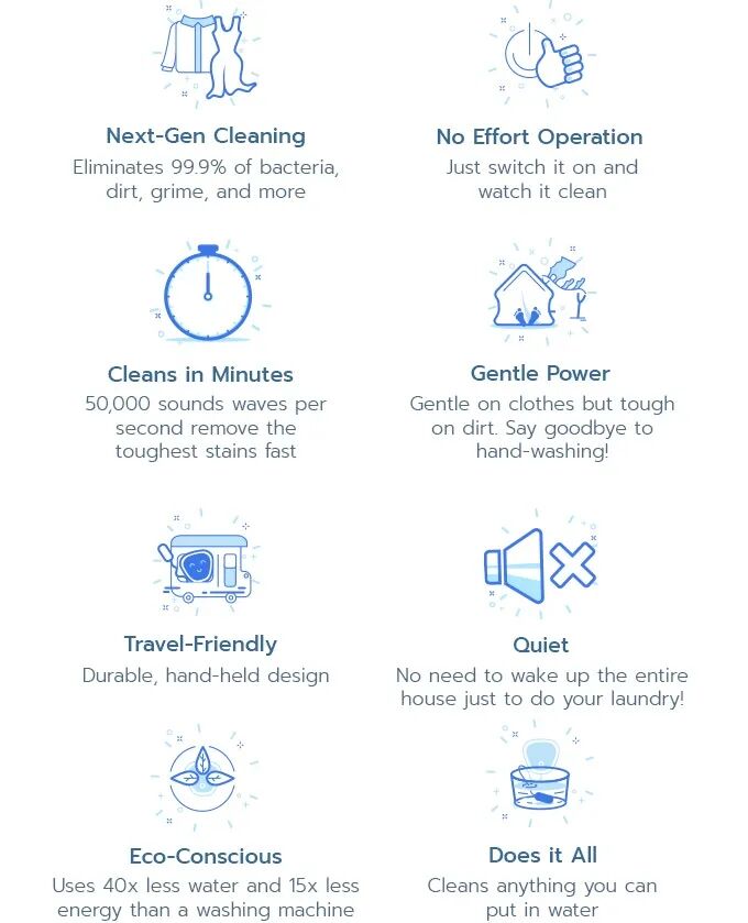 Ultrasona可以清洁包括吃穿用行几乎所有的东西,包括衣服、婴儿器皿、餐具、水果蔬菜、工作靴、乙烯树脂油漆刷、手表、牙刷化妆刷等只要你可以放入水池中的所有物品,它不会与你的物品发生物理接触,因此不会有拉伸、撕裂、褪色或缠结的风险。