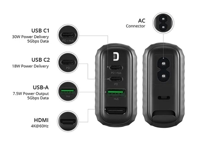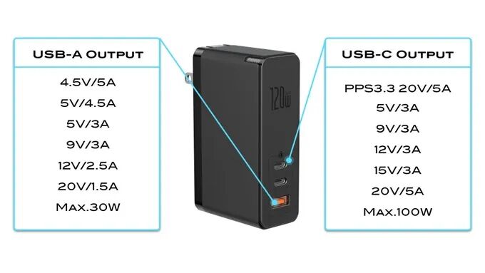 Galio有三个USB端口,可以同时为三个设备快速充电,其中两个Type-C端口的最大额定功率为100W(20V / 5A),和1个标准USB端口,最大额定功率为30W。