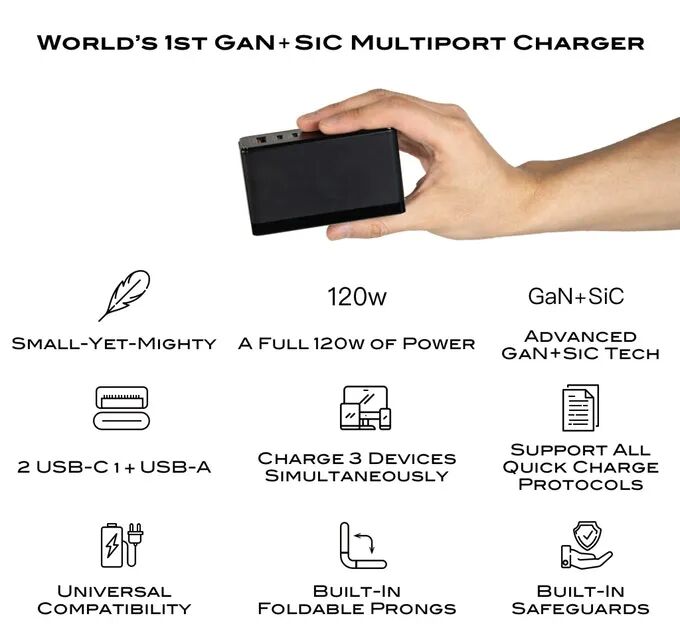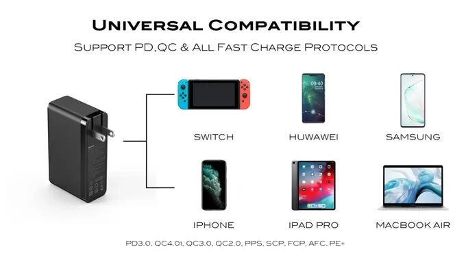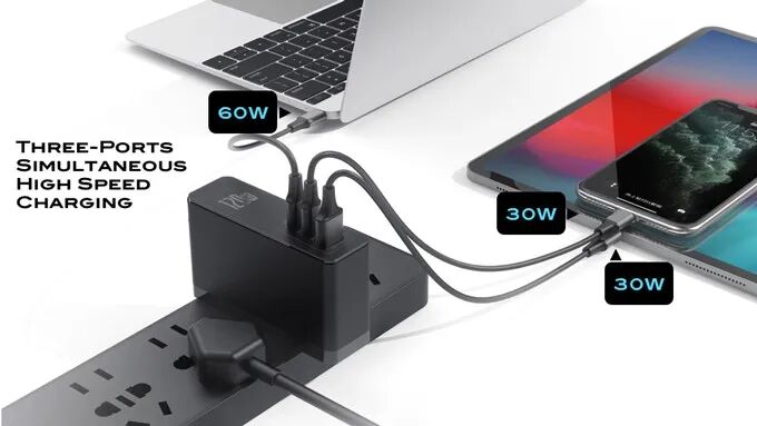 单独使用时,每个Type-C端口可在一个多小时内为MacBook Pro 16英寸(96W超快速充电)或三星Galaxy Note 10 + / S20(以 45W超快速充电)充满电;而USB-A可以在一个小时内将11英寸的iPad Pro充满电。