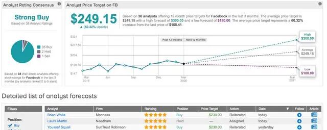 Facebook是否得到了来自其他人的同样支持?是的,确实。当多头给出35个买入评级时,2个“卖出”评级的意义就显得微不足道了。“强烈买入”的共识评级给出了每股249.15美元的目标价,意味着上涨潜力为60%。