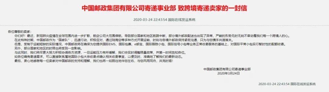 您可以通过点击【新闻公告】,进入我司官网查看!为了让卖家更方便的查看每日资讯,CNE 递一物流<订阅号> 也在紧密筹备中,敬请期待! 以下为大家带来截止3月26日18:00的最新资讯汇总~ 截至北京时间26日6时,意大利累计新冠肺炎确诊病例升至74386例,累计死亡病例7503例,累计确诊病例比上一日增加5210例。世卫组织助理总干事拉涅利•古埃拉接受媒体采访时表示,意大利可能会在本周迎来疫情高峰。 【CNE全球特惠】、【CNE全球经济】部分邮编区域禁止派送(详见CNE官网-文件下载),国外也不再进行首次扫描;其他区域正常派送,可能会延误24小时。 意大利平邮渠道:各个物流中心及物流网络的运作受到一定影响,部分包裹的揽收和处理可能会有延误。实行无接触派送模式,邮递员会结合收件人实际情况和要求选择寄放邮箱、送至邮局等方式派送。 当地时间25日,西班牙副首相卡门·卡尔沃新冠病毒检测呈阳性。此前,西班牙社会平等部大臣感染新冠肺炎病毒,西班牙首相桑切斯的妻子贝戈尼娅也被确诊。截至北京时间3月26日7时,西班牙累计确诊49515例。 西班牙邮局办公时间改为9:30-12:30,对派送时效有所影响。西班牙平邮:自3月13号起,以下邮编的地区(所属Igualada town)包裹暂停派送(已发出的包裹暂时存放在仓库)08700/08711/08712/08717/08719/08710/08788以下邮局/自提点暂停运作:08700/08710/08788 西班牙专线:目前以下邮编派送受限: 08700 Igualada 08711 Òdena 08788 Vilanova del Camí 08710 Sta. Margarida de Montbui 德国本土目前无影响,转运到其他国家的货物可能由于边境限制、国际运输的变化等问题造成延误。 德国DHL:为了尽量避免人员接触,包裹派送给收件人时,当着收件人的面,由派送员签字包裹; 德国DPD:实施无接触派送。 印度总理莫迪于当地时间3月24日晚上8点开始对全国发表讲话,他宣布从25日0时起印度将实行21天的彻底封锁。 目前消息,所有至印度的国际客机航班暂停一周。受此影响,我司【CNE全球通挂号】、【CNE全球特惠】至印度暂停收寄,且印度本土已暂停清关,已在国际运输途中的包裹将受到延误。如有任何变化,我司另行通知。 法国自3月17日开始采取“封城”措施及一系列管制措,截止3月26日法国累积确诊25,233例,死亡1,331例。 Colissimo:将于3月25号和3月28号停止所有邮政服务,包括提货收货分拣派送。从3/30开始,提货、hub接收货物、派送时间将改成一周三天,分别为周三,周四和周五。无法保证48h派送时效。实施无接触派送,放门口或信箱。自提点关闭,无法去自提点取件。禁止派送区域详细见CNE官网-文件下载。 Coliprive:630,680开头的邮编派送有延误; 另外,所有首次派送不成功的包裹,包裹无法被送到第三方暂存点,会安排第二次派送服务; 美国:洛杉矶宣布关闭提供非基本服务的企业,LAX清关可能会有所延误;其他口岸暂时没有影响 澳大利亚:派送-目前有些站点关闭,会让临近站点派送,可能会造成延误 奥地利:【CNE全球特惠】至奥地利部分邮编区域禁止派送(详见CNE官网-文件下载);其他区域正常派送,但可能会有延误。受各国不同程度的转运限制影响,【CNE全球通小包】、【AT小包】部分国家暂时无法转运(详见CNE官网-文件下载) 捷克共和国:【CNE全球特惠】、【CNE全球通挂号】-捷克783,784,58401,78321, 78324, 78391, 78401区域禁止派送(详见CNE官网-文件下载)首次扫描无影响 3月24日,中国邮政速递物流发布了《致跨境寄递卖家的一封信》,表明“受制于运能短缺的实际情况,中国邮政将在确保为您提供国际EMS、国际包裹、e邮宝、国际跟踪小包、国际挂号小包等业务正常收寄服务的基础上,对国际平常小包实行暂时性的配额收寄。”,受此影响eBay和Wish纷纷发布公告。 CNE-上海平邮小包目前正常收寄,详询 400-021-5600 eBay公告:中邮平邮停止收寄 eBay:eBay接中国邮政通知:受疫情进一步扩散影响,国际航空运能持续减少,针对当前严峻形势,中国邮政决定自3月26号0点起停止收寄电商平台所有平常小包路向邮件。 Wish公告:中邮平邮小包限量 Wish:WishPost中邮平邮小包物流渠道也将从北京时间2020年3月26日凌晨0时开始进行下单限制。