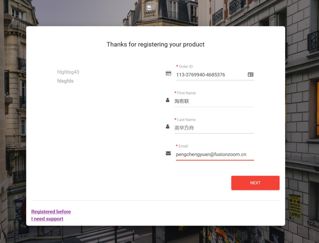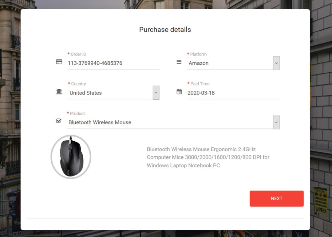 买家看到保修网站,进入落地页,提交姓名、订单号、邮箱基础信息,进行身份验证,验证成功,则到达信息确认页面