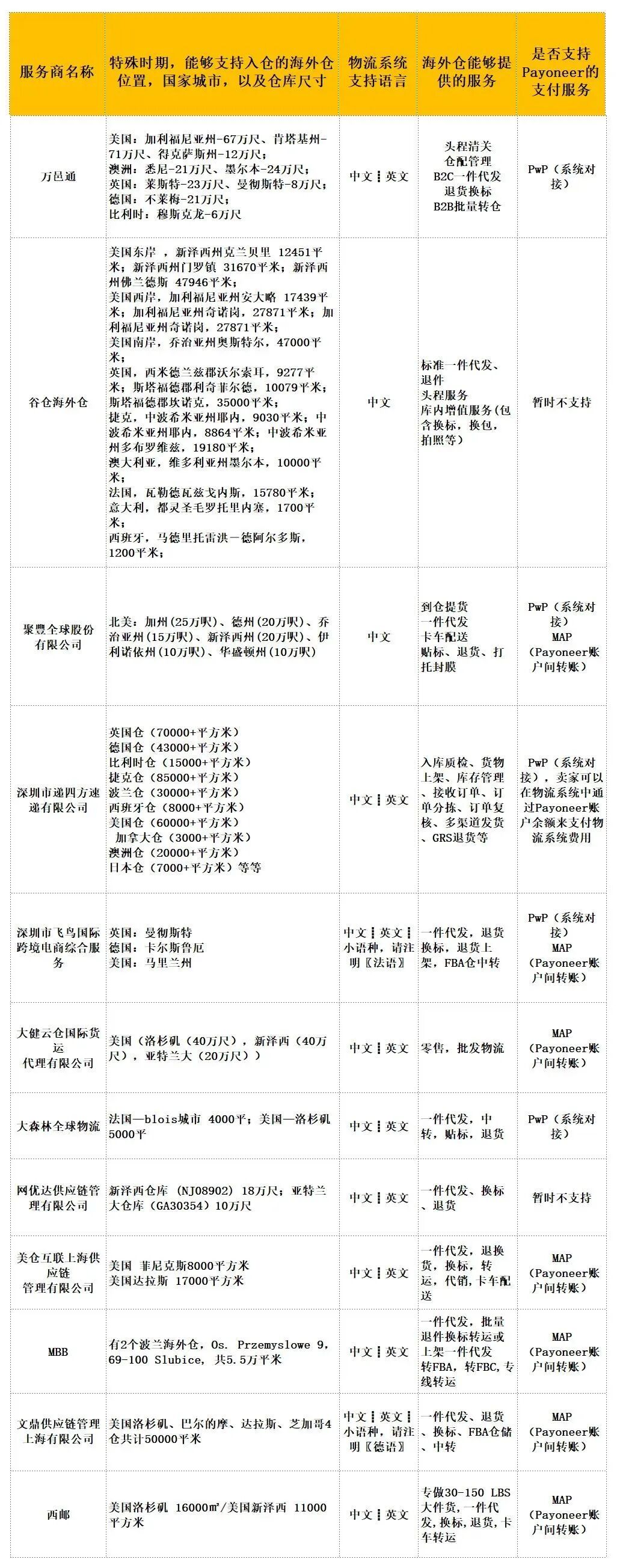 为帮助卖家对接更多海外仓资源,Payoneer特此提供美欧海外仓完整版资源表以解卖家们的燃眉之急,下图为缩略版海外仓资源表,请在公众号回复关键字“海外仓“,即可获取完整版服务商资讯,了解服务商官方信息渠道与联系方式。