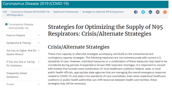CDC公告原文地址:https://www.cdc.gov/coronavirus/2019-ncov/hcp/respirators-strategy/crisis-alternate-strategies.html
