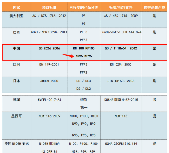 3月17日,美国疾病控制与预防中心(CDC)发布《优化N95口罩供应策略:危机/替代策略》,指出新冠肺炎疫情期间,当N95口罩供给不足时,按下表中标准生产的口罩,是N95口罩合适的替代品。其中包括采用中国标准GB 2626-2006 和GB/T 18664—2002生产的口罩。