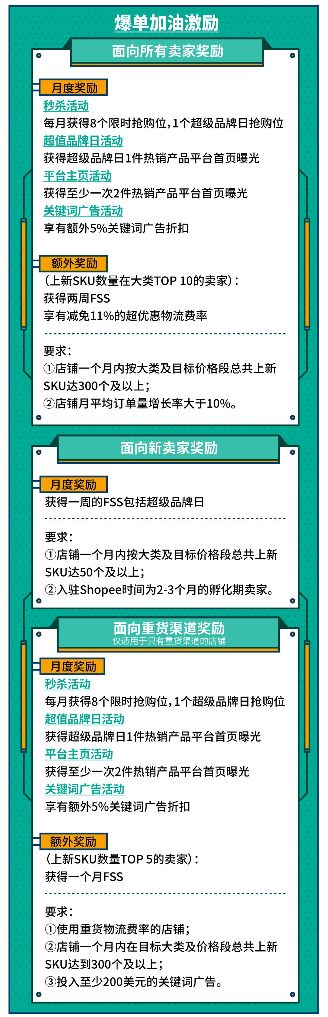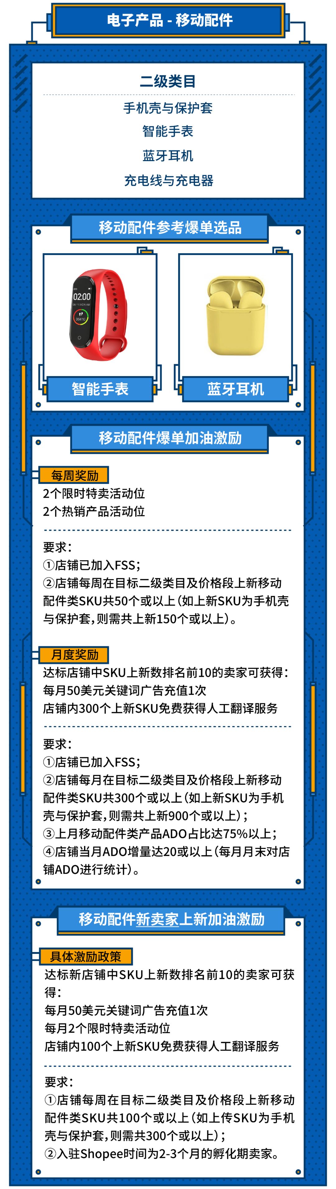 Shopee正式发布2020重点类目第三期:面向全体卖家提供激励,覆盖3大市场,共15个品类,提供诸多热门资源,更有面向新卖家、重货渠道卖家打造的独家激励,为你的店铺加满爆单值。满足条件即可获得相应激励,一次能Get 30个活动位的机会,还不快争取?