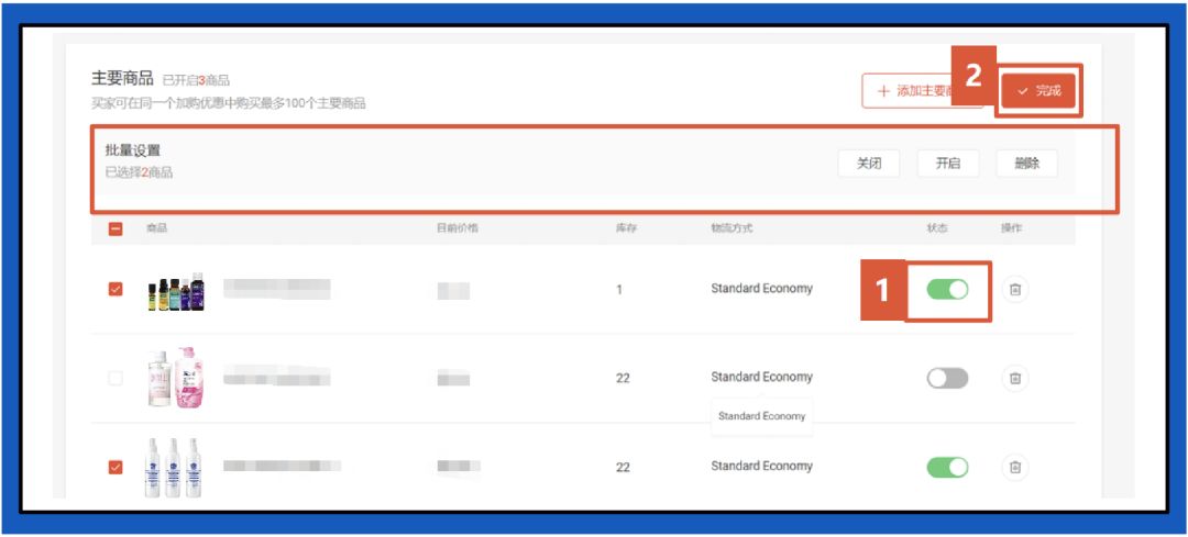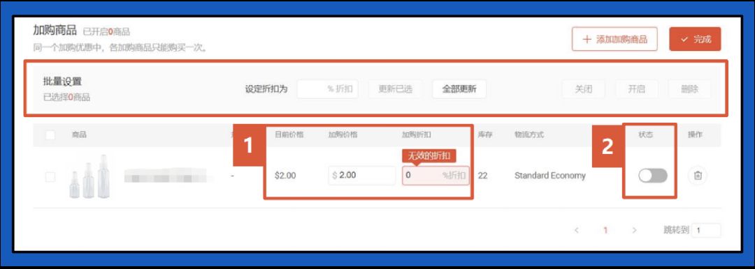 您可以选择100种加购商品,只要买家购买了主要商品,即可使用您设定好的折扣价格购买加购商品。选择确认后,输入①商品价格及加购优惠,并点击②状态切换按钮来激活加购商品。