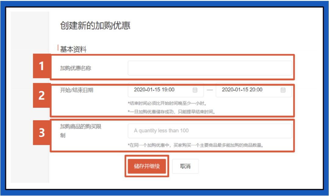 创建新的加购优惠时,您需要填写[1]名称、[2]日期以及[3]购买限制。其中购买限制是每个买家在每个订单中,在同一个主商品下可以购买的加购商品最大数量,您可以根据实际情况决定组合方式及优惠力度。
