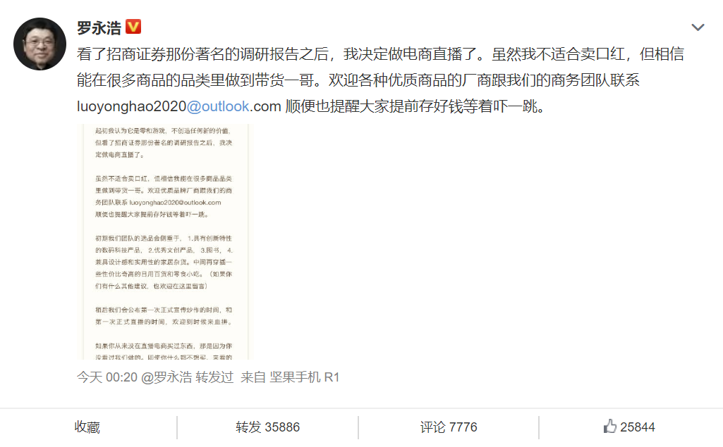 今天我们又迎来了咱们公众号“出镜率”最高的嘉宾—— 罗永浩。正是应了小编的小标题:360行,行行有老罗。就在三周前,转行卖电子烟的罗永浩在微博宣布开始卖衣服了,可能是销量不尽人意,罗永浩昨天下午又突然宣布:决定做直播了!顺便还在当天把自己送上了热搜~从2018到2020,罗永浩的创业轨迹似乎就是在诠释着那句话——生命在于折腾~不过关于老罗的直播生涯的开启,这一次他似乎还是做了很多的调研的。