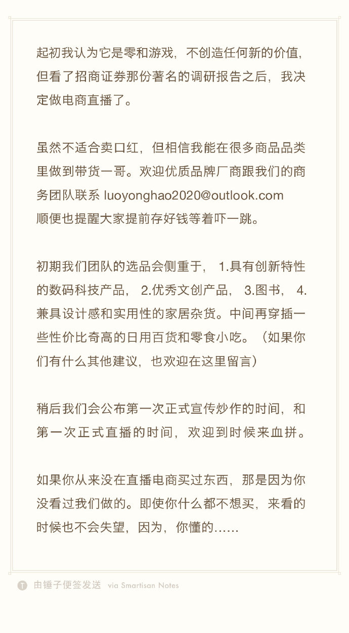 关于选品方面,罗永浩表示团队初期会侧重于具有创新特性的数码科技产品、优秀文创产品、图书、家居杂货以及日用百货和小零食,主打性价比。如果没有意外,初期是周播,然后是一周三播,最后是日播,欢迎网友积极留言提建议,也欢迎优质品牌厂与团队联系商务合作,这次绝不会让大家失望。