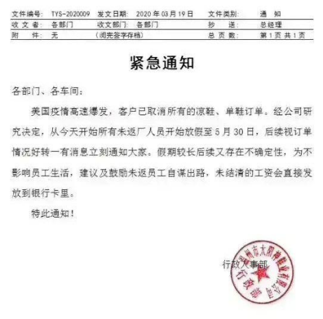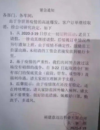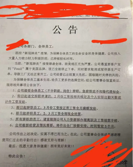 东莞某外贸公司员工称,其公司客户已经全部停止下单,公司要求取消或暂停原订单生产,导致工厂无法正常开工,加上长时间投入了大量人力物力财力积极防控,公司经营出现重大危机,给出了如下公告,接受全体员工辞职: