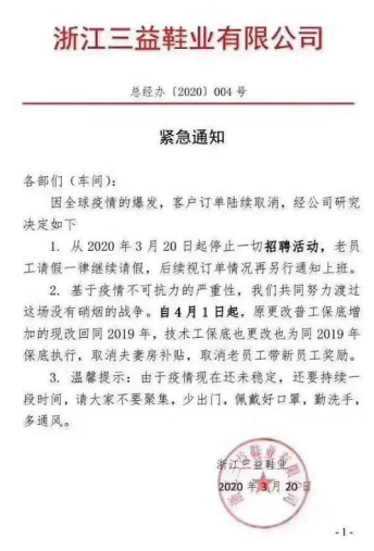 受此影响,浙江、福建、广东等地的多家工厂不得不暂停招人、取消各项福利,有的甚至降薪、裁员、放长假。